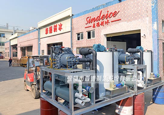片冰機(jī)通電運(yùn)行,制冷劑(冷媒)通過壓縮機(jī)的做功變成高溫高壓的蒸汽工質(zhì),再流入冷凝器與外界換熱,放出熱量變成高壓液態(tài)工質(zhì),流經(jīng)過濾器過濾后通過膨脹閥降壓降溫為汽液混合狀態(tài),然后進(jìn)入蒸發(fā)器,與片冰機(jī)蒸發(fā)器內(nèi)壁上的水進(jìn)行熱交換,吸收大量的熱,使水急劇降到結(jié)冰點(diǎn)以下溫度,瞬速結(jié)冰。此時(shí)制冷劑經(jīng)過吸收熱量后蒸發(fā)成為氣態(tài),被吸入壓縮機(jī)內(nèi)進(jìn)行循環(huán),從而實(shí)現(xiàn)循環(huán)制冷。