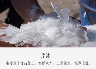 由于片冰巨大的表面積,其熱交換過程迅速,片冰可以迅速融化成水、帶走熱量、為被混合物增加濕度,廣泛用于海鮮水產急凍保鮮、超市生鮮、食品加工、漁業、混泥土攪拌等。