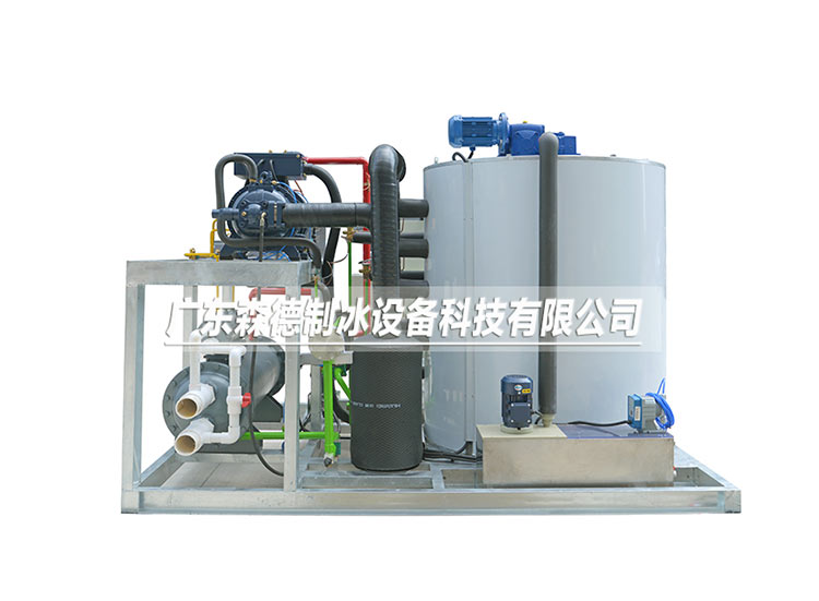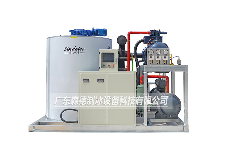 片冰機主要由壓縮機、膨脹閥、冷凝器、蒸發器組成,形成一個循環封閉的制冷系統。片冰機蒸發器為垂直豎立的桶裝結構,主要由冰刀、主軸、灑水盤、接水盤組成。它們在減速機的帶動下,逆時針緩慢旋轉。水從片冰機蒸發器的進水口進入分水盤,通過灑水盤,將水均勻的灑在蒸發器內壁,形成水膜;水膜與蒸發器流道中的制冷劑進行熱交換,溫度迅速降低,在蒸發器內壁上形成一層薄冰,在冰刀的擠壓下,碎裂成片冰,從落冰口掉入儲冰庫。部分未結成冰的水通過接水盤從回水口回流到冷水箱內,通過冷水循環泵進入下一個循環。