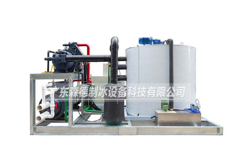 片冰機主要由壓縮機、膨脹閥、冷凝器、蒸發(fā)器組成,形成一個循環(huán)封閉的制冷系統(tǒng)。片冰機蒸發(fā)器為垂直豎立的桶裝結(jié)構(gòu),主要由冰刀、主軸、灑水盤、接水盤組成。它們在減速機的帶動下,逆時針緩慢旋轉(zhuǎn)。水從片冰機蒸發(fā)器的進(jìn)水口進(jìn)入分水盤,通過灑水盤,將水均勻的灑在蒸發(fā)器內(nèi)壁,形成水膜;水膜與蒸發(fā)器流道中的制冷劑進(jìn)行熱交換,溫度迅速降低,在蒸發(fā)器內(nèi)壁上形成一層薄冰,在冰刀的擠壓下,碎裂成片冰,從落冰口掉入儲冰庫。部分未結(jié)成冰的水通過接水盤從回水口回流到冷水箱內(nèi),通過冷水循環(huán)泵進(jìn)入下一個循環(huán)。